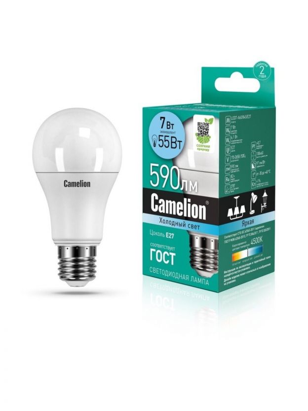 Лампа светодиодная E27, 7 Вт, 55 Вт, 220 В, груша, 4500 К, нейтральный белый свет, Camelion, 11254/13735
