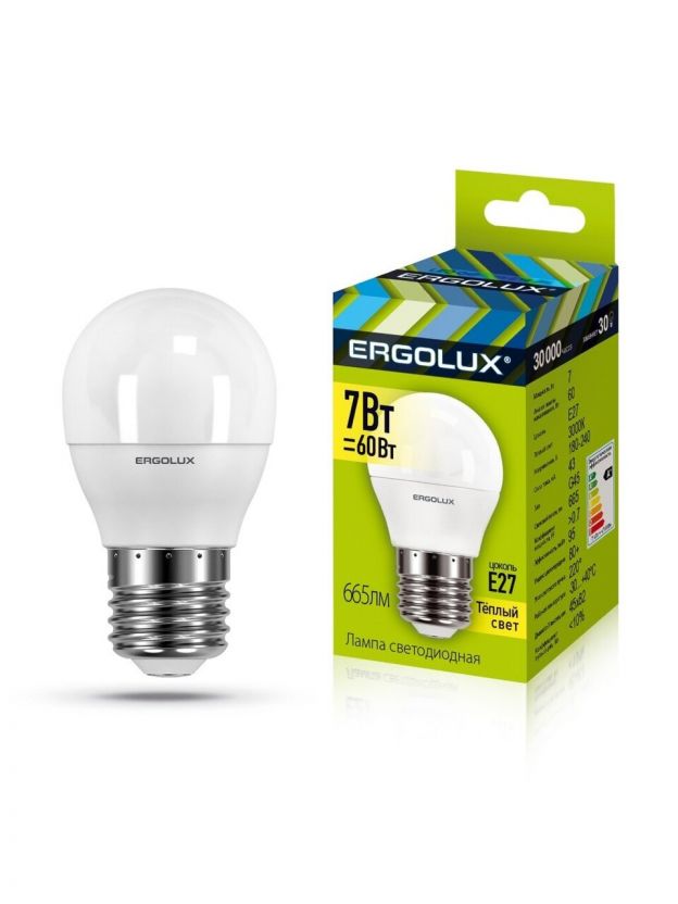 Лампа светодиодная E27, 7 Вт, 60 Вт, 220 В, шар, 3000 К, теплый белый свет, Ergolux, 12143