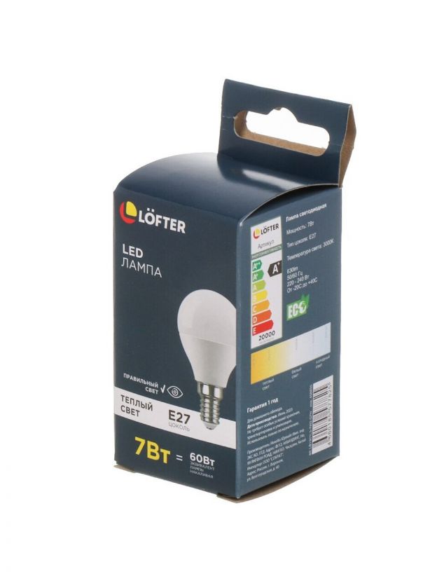 Лампа светодиодная E27, 7 Вт, 60 Вт, 220 В, шар, 3000 К, теплый белый свет, Lofter