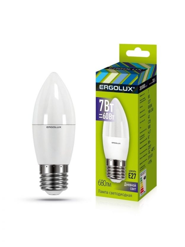 Лампа светодиодная E27, 7 Вт, 60 Вт, свеча, 6500 К, холодный белый свет, Ergolux, 13299