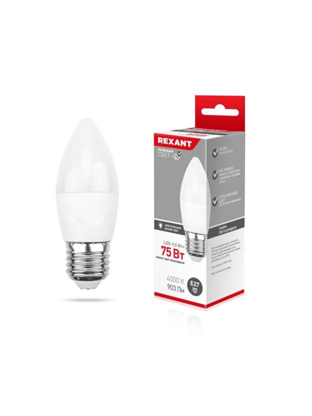 Лампа светодиодная E27, 9.5 Вт, 75 Вт, свеча, 4000 К, нейтральный белый свет, Rexant, CN, 604-026