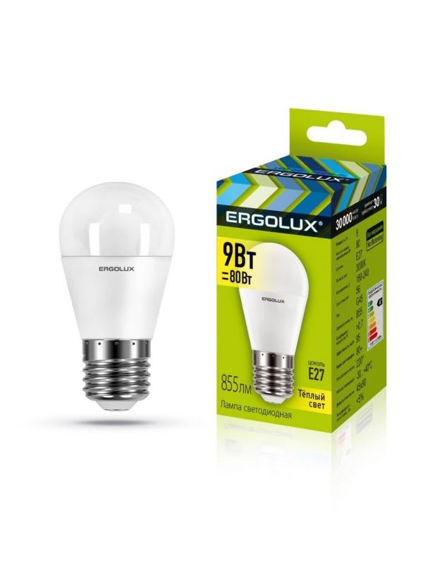 Лампа светодиодная E27, 9 Вт, 80 Вт, 220 В, шар, 3000 К, теплый белый свет, Ergolux, 13176