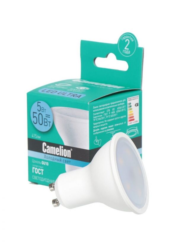 Лампа светодиодная GU10, 5 Вт, 50 Вт, 220 В, рефлектор, 4500 К, нейтральный белый свет, Camelion, 10957