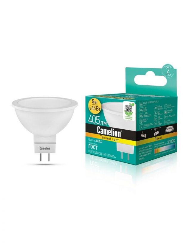 Лампа светодиодная GU5.3, 5 Вт, 45 Вт, 220 В, рефлектор, 3000 К, теплый белый свет, Camelion, 12041