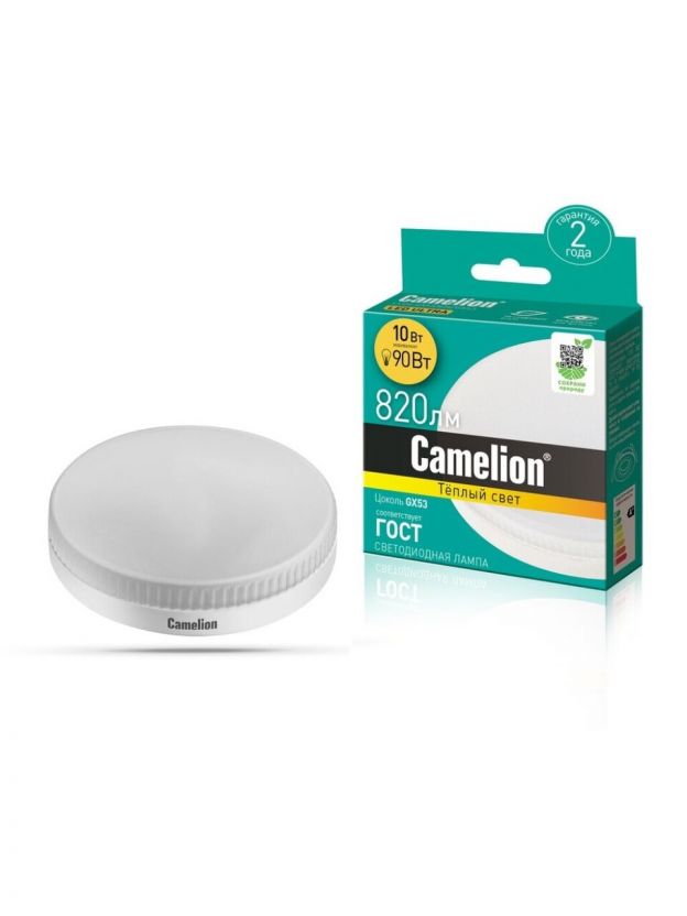 Лампа светодиодная GX53, 10 Вт, 90 Вт, 220 В, таблетка, 3000 К, теплый белый свет, Camelion, 12053