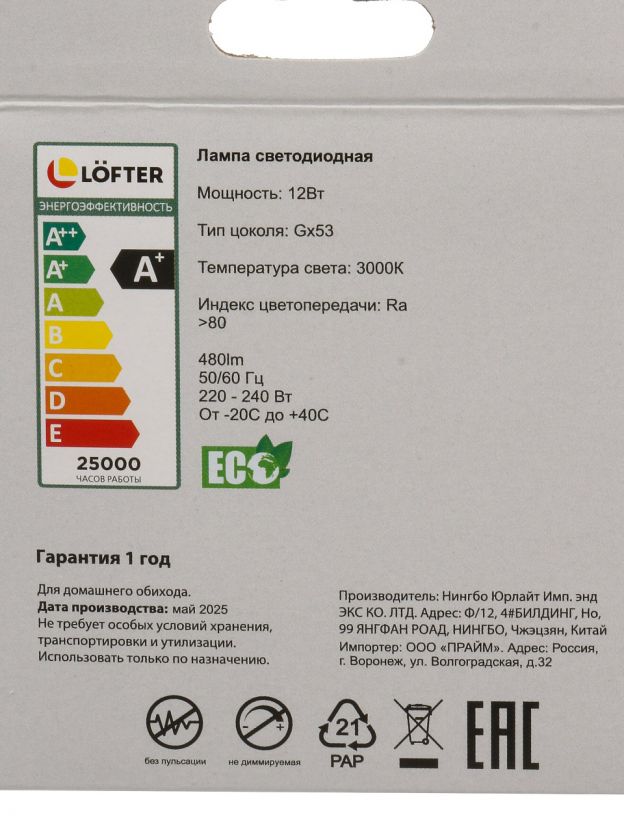 Срок службы — 25 000 часов, гарантия от производителя — 12 месяцев. Мощность 12 Вт, световой поток 480 лм, температура свечения 3000 К, индекс цветопередачи CRI 80.