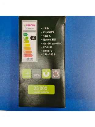 Лампочка светодиодная для растений, E27, 15 Вт, 220 В, IP40, A80, 80х153 мм, Grandy, FITO, AI-2605003