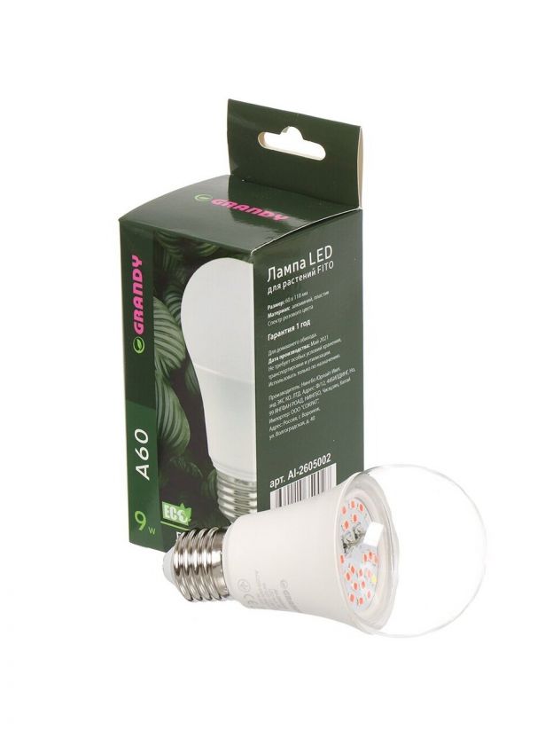Лампочка светодиодная для растений, E27, 9 Вт, 220 В, IP40, A60, 60х118 мм, Grandy, FITO, AI-2605002