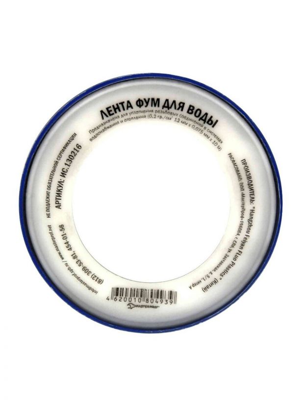 Лента ФУМ для воды, 10 м, малая, белая, MasterProf, индивидуальная упаковка, ИС.130216