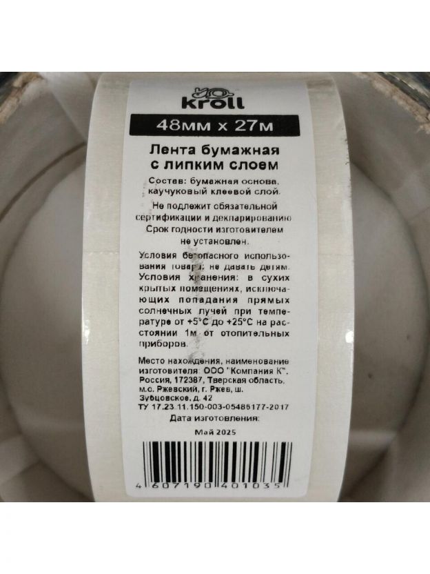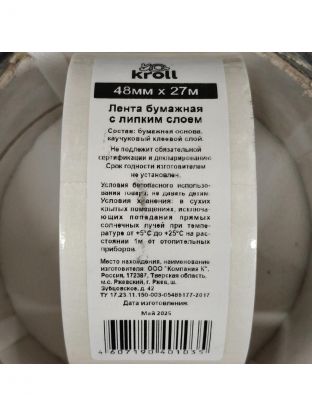 Лента малярная 48 мм, основа бумажная, 27 м, Kroll, крепированная, 015/27