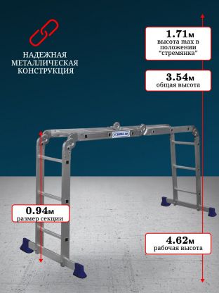 Лестница-трансформер — это шарнирная лестница состоящая из отдельных секций, соединенных между собой шарнирными замками. Каждый шарнир позволяет фиксировать различный угол между секциями. Это позволяет использовать лестницу-трансформер во многих модификациях: приставная лестница, стремянка, консольная лестница и многое другое. Шарнирная лестница может складываться в 4 раза, что придает ей очень компактные размеры. При одинаковой длине в приставном виде шарнирная лестница в сложенном виде будет всегда намного компактней, чем трехсекционная универсальная лестница. Даже самая большая лестница-трансформер влезает в багажник легкового автомобиля.