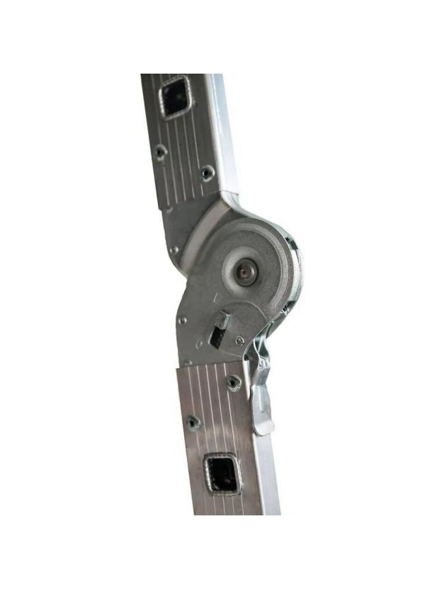 - Шарнирное стальное соединение повышенной прочности. Даёт возможность принимать разные позиции и надёжно фиксировать лестницу.