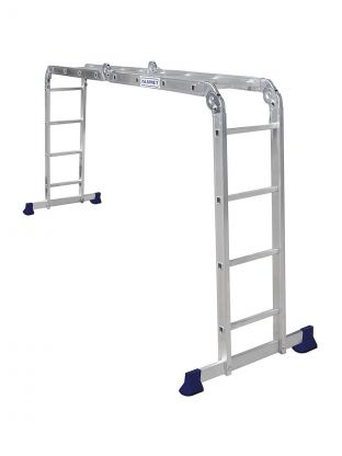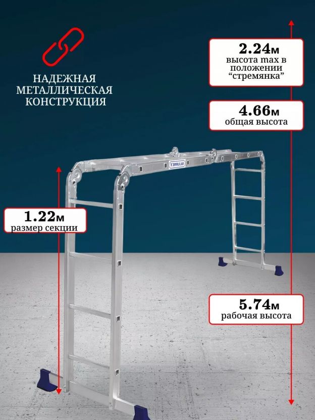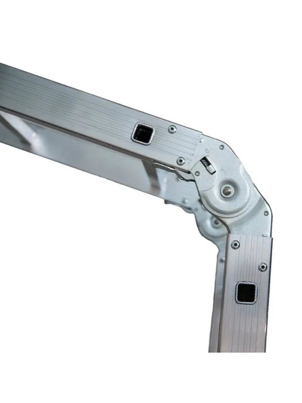 Лестница-трансформер — это шарнирная лестница состоящая из отдельных секций, соединенных между собой шарнирными замками. Каждый шарнир позволяет фиксировать различный угол между секциями. Это позволяет использовать лестницу-трансформер во многих модификациях: приставная лестница, стремянка, помост, консольная лестница и многое другое. Шарнирная лестница может складываться в 4 раза, что придает ей очень компактные размеры. При одинаковой длине в приставном виде шарнирная лестница в сложенном виде будет всегда намного компактней, чем трехсекционная универсальная лестница. Даже самая большая лестница-трансформер влезает в багажник легкового автомобиля.