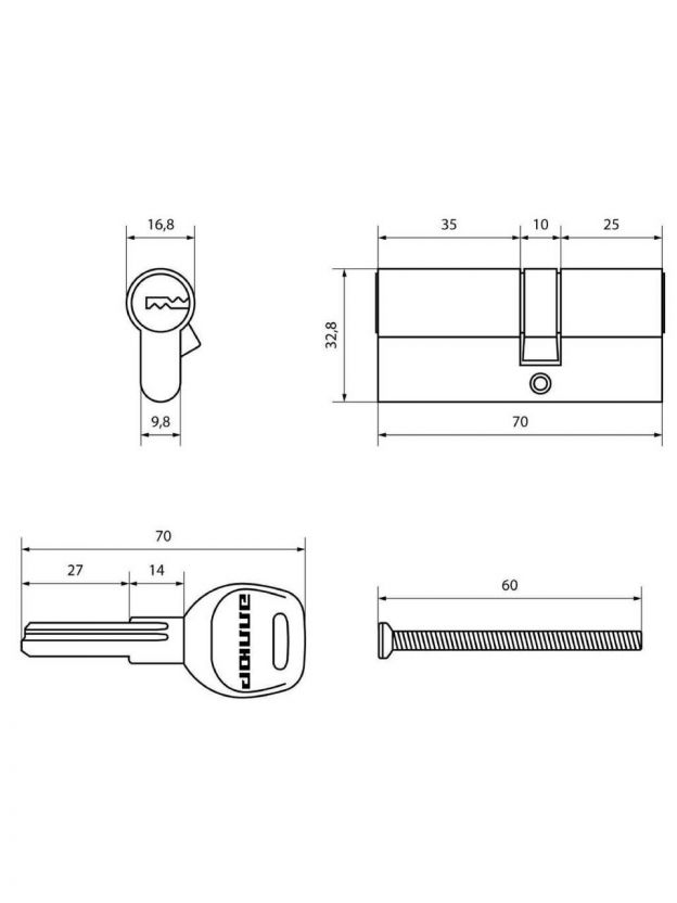 Личинка замка двери Аллюр, HD F 70-5К CP, 7 793, 70 мм, хром, 5 перфоключей