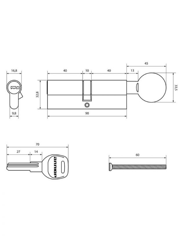 Личинка замка двери Аллюр, HD FG 90-5К CP 30Gx10x50, 7 824, 90 мм, хром, 5 перфоключей/вертушка