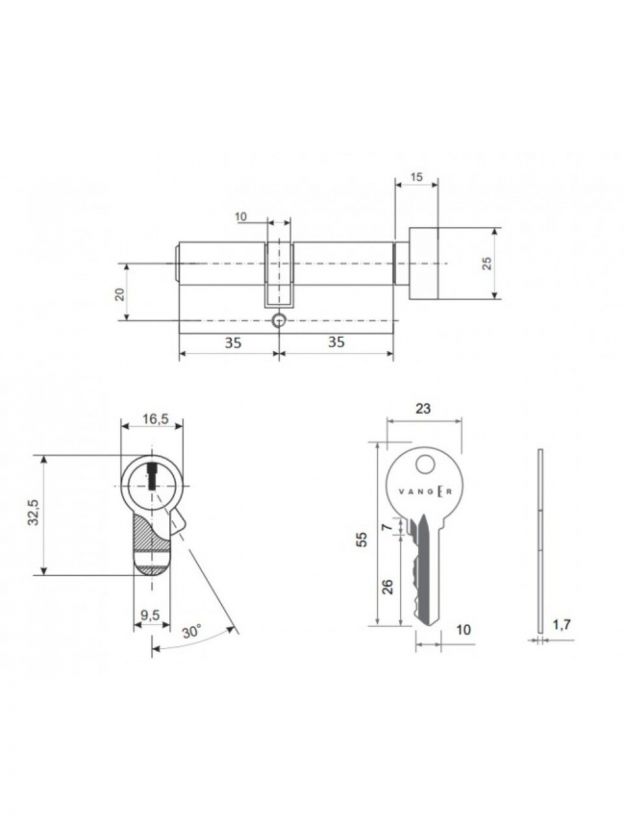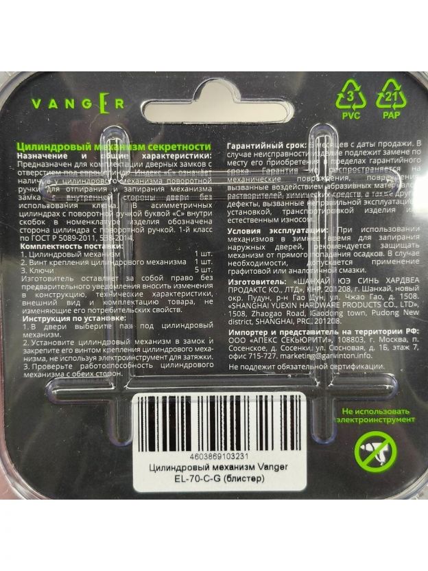 Личинка замка двери Vanger, EL-70-C-G, 29695, алюминий, золото, скин упаковка