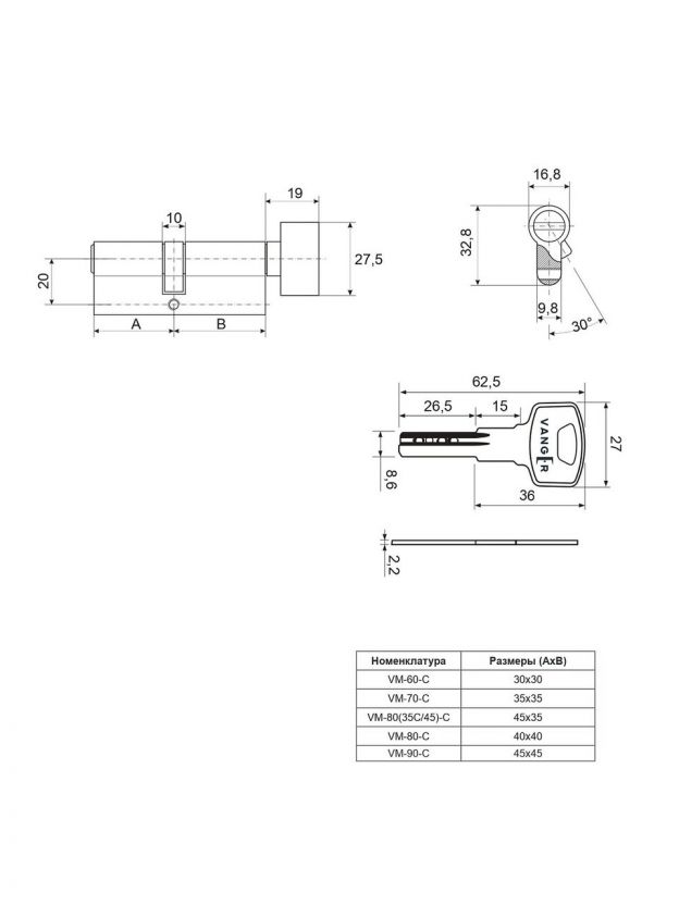 Личинка замка двери Vanger, VM-60-C-CR, 33593, алюминий, 60 мм, с заверткой, хром