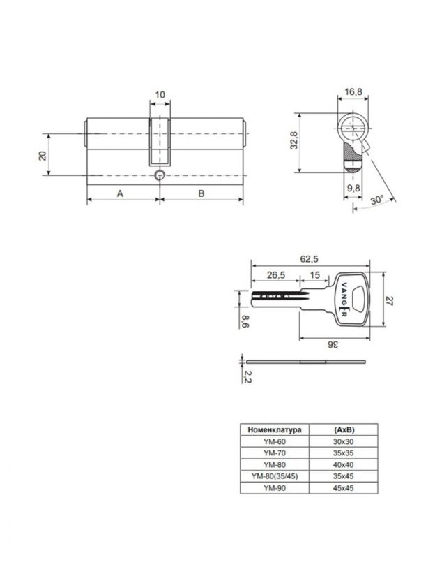 Личинка замка двери Vanger, YM-80-CR, 33933, 80 мм, никель