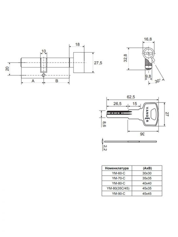 Личинка замка двери Vanger, YM-90-C-CR, 33934, 90 мм, с заверткой, никель
