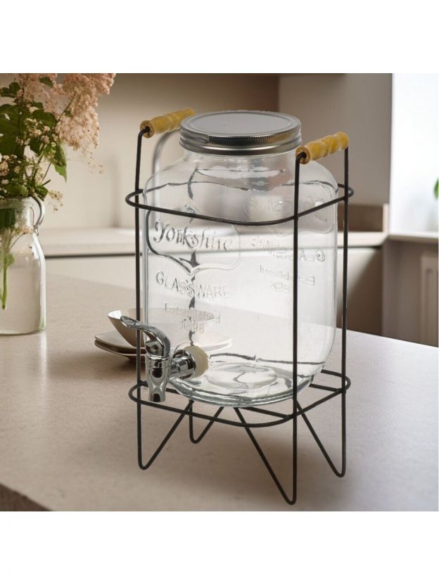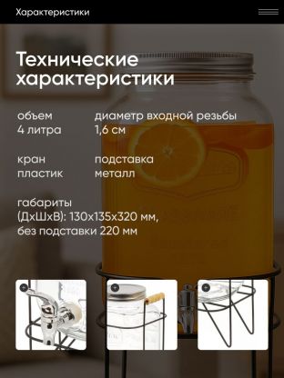 Изящный стеклянный диспенсер для напитков превратит Вашу сервировку в настоящее произведение искусства. Оптимальный объем 4 литра позволит подать к столу достаточное количество сока или лимонада даже для большой компании.