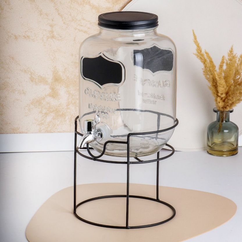 Лимонадница Daniks не только радует глаз, но и приносит практическую пользу. Прозрачное стекло позволяет легко следить за уровнем напитка, а удобная крышка защищает его от загрязнений. Черная металлическая подставка добавляет устойчивости и стиля, делая лимонадницу не только функциональным, но и декоративным элементом. Это идеальное решение для тех, кто ценит качество, стиль и удобство в использовании. Превратите подачу напитков в настоящее искусство и создайте неповторимую атмосферу на вашем столе.