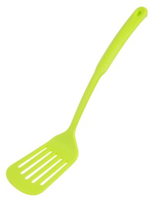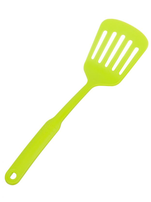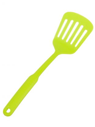 Лопатка выполнена из прочного полимера (нейлон), цвет лайм, подвесная конструкция, подходит для всех типов посуды.