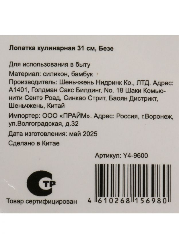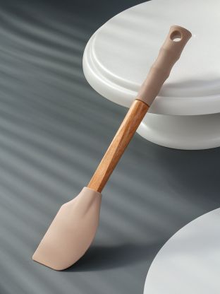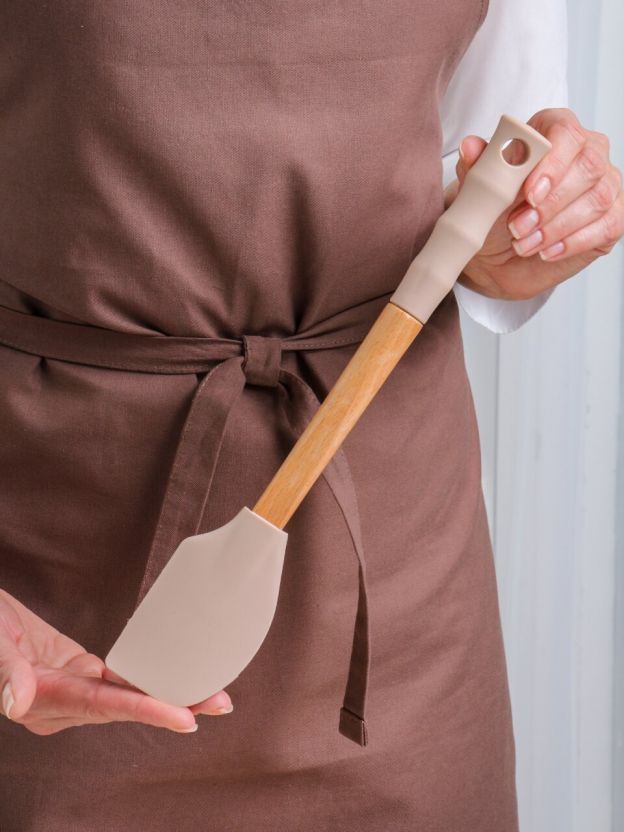 Длина — 31 см, рабочая часть — пищевой силикон, ручка — бамбук и силикон, цвет — бежевый. Легко подвешивается за навеску, ручная мойка.