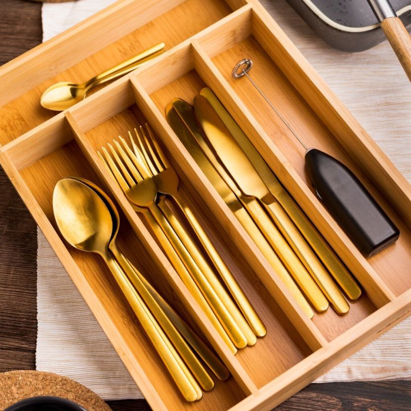 Лоток изготовлен из бамбука и имеет 5 отделений для столовых приборов и кухонной утвари. Оригинальная подставка для столовых приборов, выполненная из природного материала, украсит любую кухню. Хорошо впишется в любой интерьер. Не займет много места, а столовые приборы будут всегда под рукой.