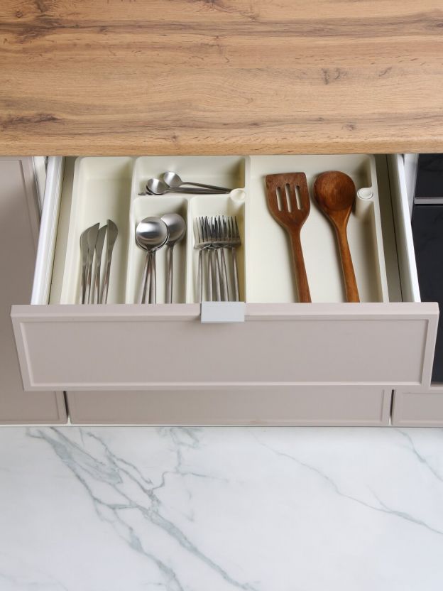 - Раздвижная конструкция — легко подстраивается под размеры вашего ящика, экономит место и сохраняет порядок