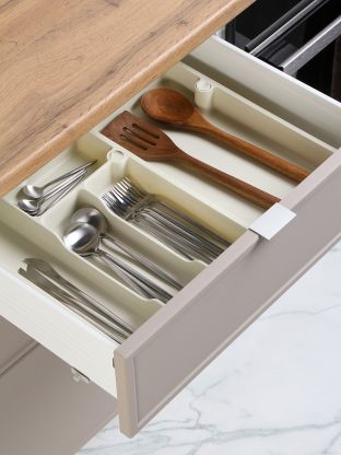 Благодаря раздвижной конструкции, лоток легко регулируется по ширине для оптимального размещения в большинстве стандартных кухонных ящиков. Точные параметры указаны в карточке товара.