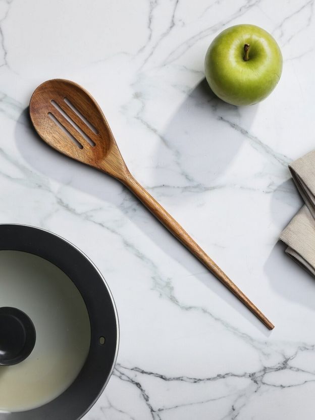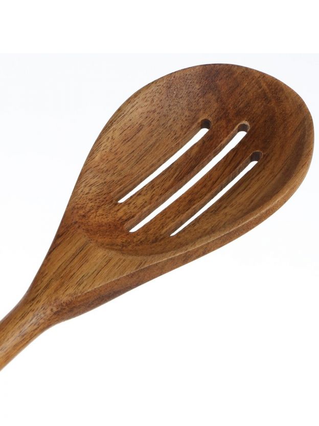 - Экологичная ложка из массива акации — не царапает антипригарное покрытие, устойчива к влаге и запахам.