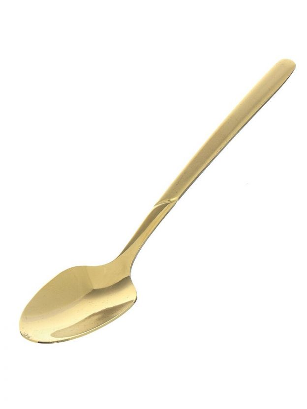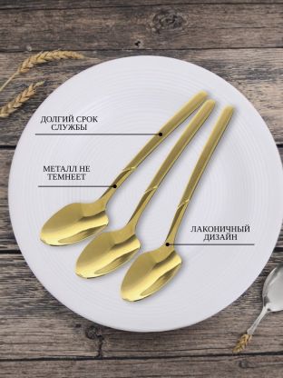 Длина каждой ложки — 13,4 см, материал — нержавеющая сталь с золотым напылением, ручка тонкая и металлическая, цвет — золотой.