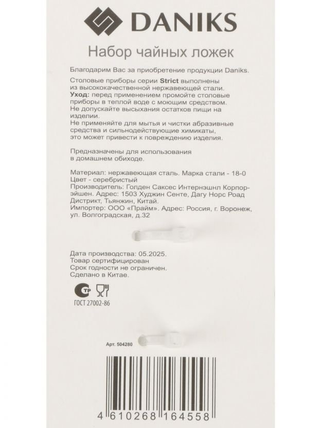 Ложка из нержавеющей стали Daniks Strict — это оптимальный выбор для тех, кто ищет баланс между ценой, долговечностью и эстетикой. Благодаря прочному материалу, изделие не подвержено ржавчине и сохраняет первоначальный блеск даже при частом использовании и мытье в посудомоечной машине. Такой набор чайных ложек подойдет для ежедневного чаепития, сервировки стола на праздники, а также для использования на даче.
