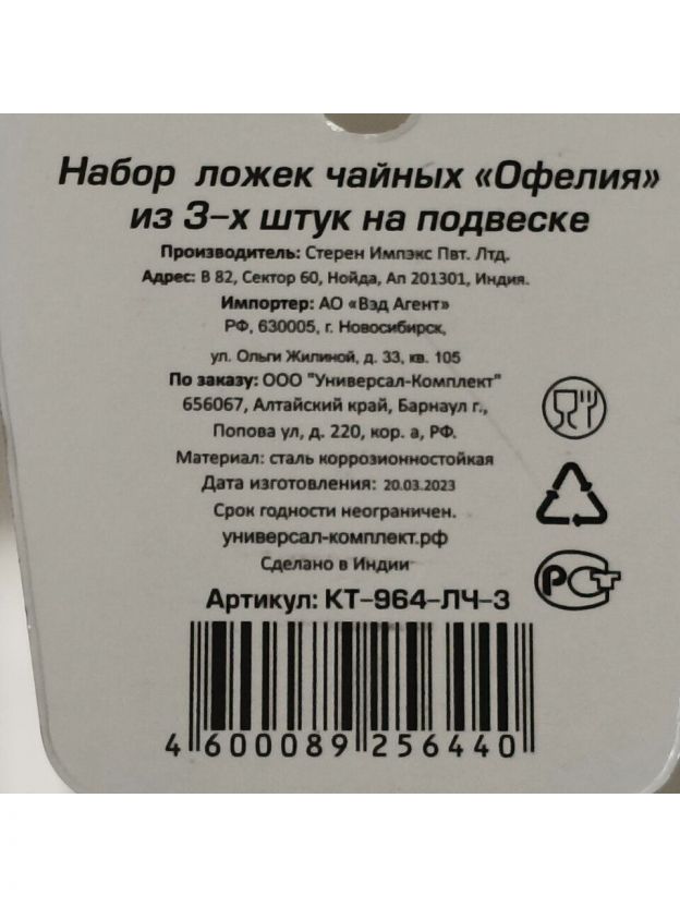 Ложка нержавеющая сталь, 3 предмета, чайная, Катунь, Офелия, КТ-964-ЛЧ-3, на подвесе