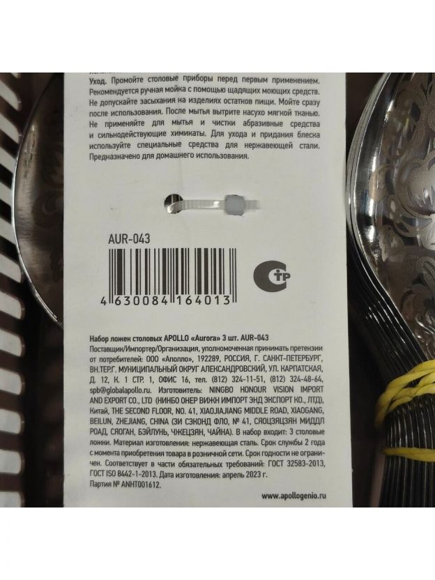Ложка нержавеющая сталь, 3 предмета, столовая, Apollo, Aurora, AUR-043