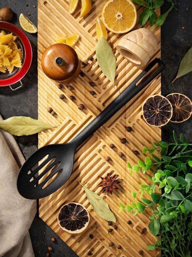 Ложка Daniks Turin с прорезями позволяет с удобством перемешивать и раскладывать блюда по тарелкам. Эргономичная конструкция модели с отверстием для хранения на крючке.