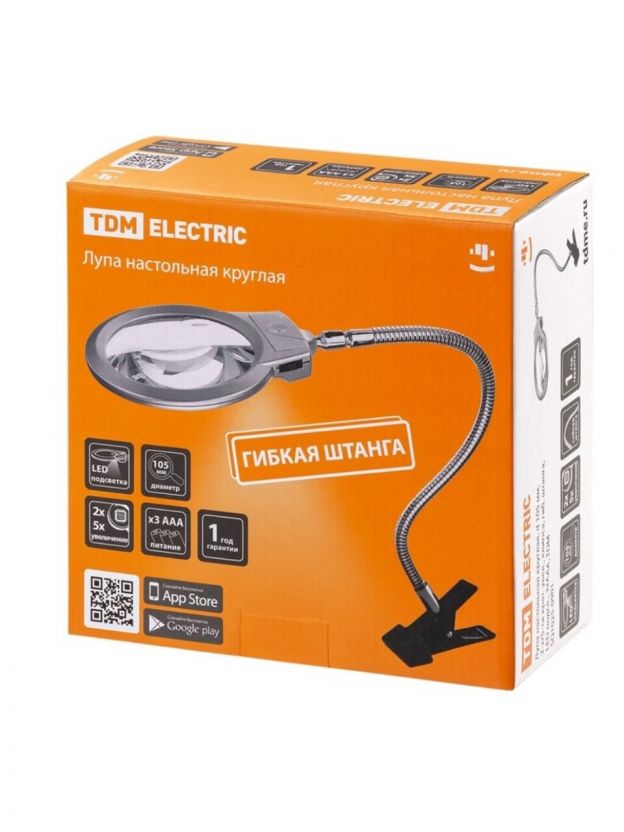 Лупа настольная, круглая, d 105 мм, двух-пяти кратное увеличение, подсветка, гибкая штанга, штанга, 3хААА, TDM Electric, SQ1025-0901
