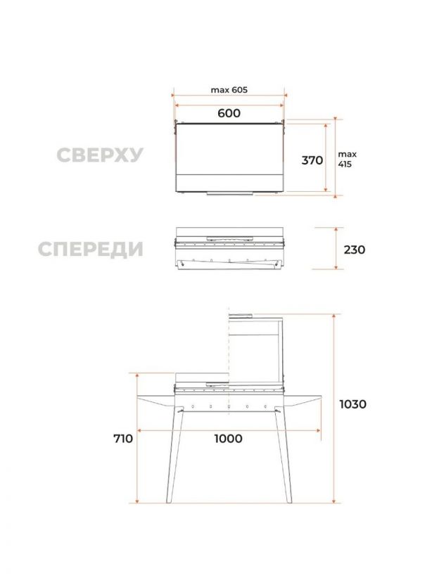Длина мангала — 1010 мм, рабочая зона — 600х410 мм, высота 700 мм. Подходит для приготовления шашлыка на 8–10 персон одновременно.