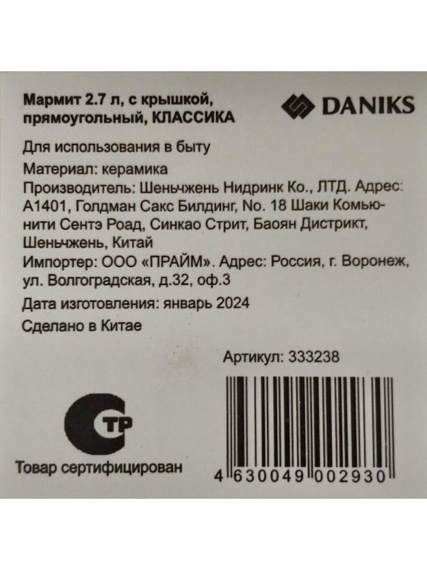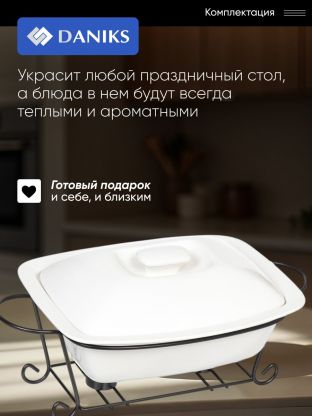 Мармит керамика, 2.7 л, с крышкой, прямоугольный, Daniks, Классика, Y4-2753, белый