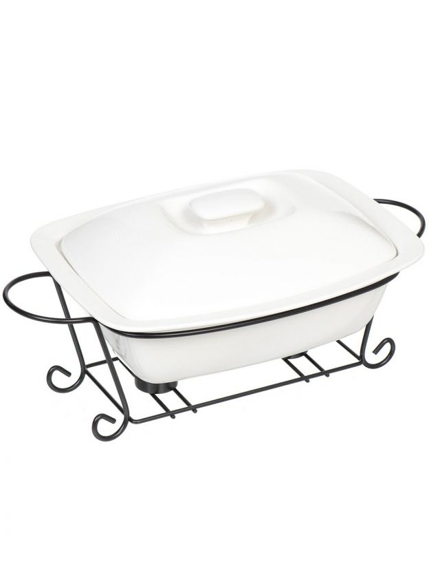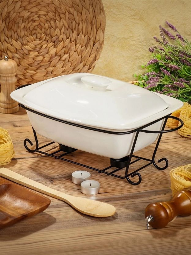 Мармит выполнен из керамики белого цвета. Керамическая чаша с удобными ручками располагается на стальной подставке с двумя подсвечниками для чайных свечей (не входят в комплект). Свеча устанавливается на подставку, нагревает чашу снизу, таким образом поддерживая нужную температуру приготовленного блюда. Крышка прикрывает чашу сверху, не давая остыть блюду. Благодаря своему элегантному дизайну, мармит с приготовленным блюдом можно сразу подавать на стол, не перекладывая еду на сервировочные тарелки. Изящный, с современным дизайном, мармит украсит любой праздничный стол, а блюда в нем будут всегда теплыми и ароматными.