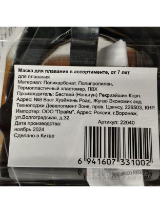 - Тип: маска для плавания.