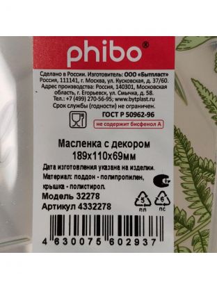 Масленка пластик, 18.9х11х6.9 см, с декором, в ассортименте, Бытпласт, С32278/4332278