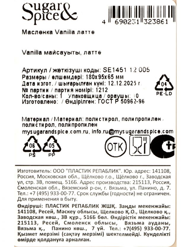 Обращайте внимание на материал (безопасный пищевой пластик), плотность крышки и размеры. Масленка Sugar&Spice Vanilla выполнена из прочного пластика, легко моется и подходит для стандартных брикетов масла.