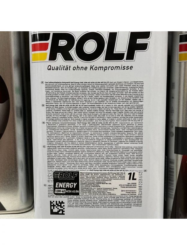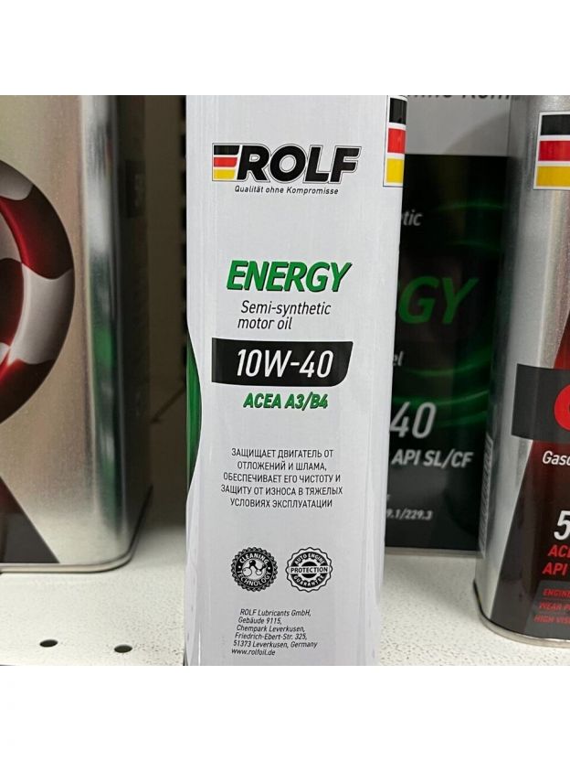 Моторное полусинтетическое масло Rolf Energy SAE 10W-40 API SL/CF - полусинтетическое высокоэффективное моторное масло производится из качественных базовых масел и современного пакета присадок. Обеспечивает надежную смазку и защиту двигателя, и высокие эксплуатационные свойства масла при увеличенных интервалах замены. Характеристики: Вид: полусинтетическое; Маркировка: 10W40; Тип тары: канистра; Объем: 1000 мл; Классификация API: SL; Классификация ACEA: A3/B4; OEM допуски: MB 229.1, API SL, ACEA A3/B4; Подходит для дизельных двигателей: да; Для легковых: да; Для грузовых: нет; Для мототехники: нет; Основа: полусинтетическая. Преимущества: Моторное полусинтетическое масло Rolf Energy обеспечивает стабильность вязкостно-температурных характеристик в течение всего срока эксплуатации; Улучшенная защита от износа продлевает срок службы двигателя и его узлов. Способствует снижению до минимума расхода на угар; Предотвращает образование высоко и низкотемпературных отложений на деталях двигателя; Способствуют легкому пуску двигателя при низких температурах.