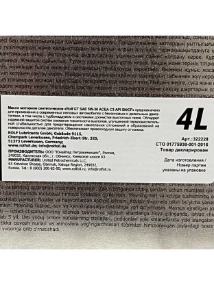Синтетическое моторное масло Rolf GT 5W-30 создано с учётом всех особенностей современных автомобилей. С ним силовой агрегат Вашего транспортного средства будет надёжно защищен от быстрого износа, а Вы – от излишних трат на ремонт. Увеличенный интервал замены – приятный бонус от использования качественного масла, который, несомненно, порадует каждого автовладельца. Забота о моторе автомобиля еще никогда не была настолько комплексной и удобной.