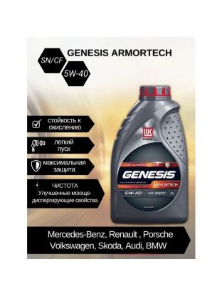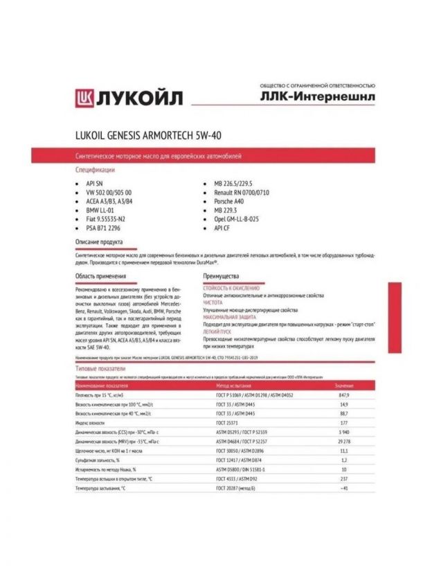 ЛУКОЙЛ GENESIS ARMORTECH 5W-40 - всесезонное полностью синтетическое моторное масло последнего поколения для применения во всех современных высокофорсированных двигателях легковых, легких грузовых, спортивных автомобилей и микроавтобусов, в том числе оборудованных турбонаддувом. Подходит для автомобилей марок: AUDI, BMW, CHERY, CITROEN, GEELY, GREAT WALL, HYUNDAI, KIA, LEXUS, LIFAN, MERCEDES-BENZ, MINI, MITSUBISHI, NISSAN, PEUGEOT, PORSCHE, RENAULT, SEAT, SKODA, SSANGYONG, SUBARU, SUZUKI, TOYOTA, VOLKSWAGEN. ЛУКОЙЛ GENESIS ARMORTECH 5W-40 производится с использованием высококачественных синтетических компонентов с применением передовой технологии пакета присадок (DuraMax), специально разработанного для ЛУКОЙЛ и обеспечивающего высокие противоизносные, антиокислительные и антикоррозионные свойства масла. Одобрено: API SN лицензировано Porsche A40 BMW LL-01 VW 502 00/505 00 MB-Approval 226.5/229.5 Renault RN 0700/0710 Соответствует требованиям: ACEA A3/B3, A3/B4 MB 229.3 Fiat 9.55535-N2/Z2 Opel GM-LL-B-025 PSA B71 2296 API CF ЛУКОЙЛ GENESIS ARMORTECH 5W-40 рекомендовано к всесезонному применению в бензиновых и дизельных двигателях (без фильтров сажевых частиц - DPF) автомобилей MERCEDES-BENZ-Benz, Renault, Volkswagen, Skoda, Audi, BMW, Porsche, KIA, Hyundai, Toyota, Nissan, Honda, Mitsubishi как в гарантийный, так и послегарантийный период эксплуатации. Также подходит для применения в двигателях, требующих масел класса API SN, ACEA A3/B3, A3/B4 и класса вязкости SAE 5W-40. Отличные антиокислительные и антикоррозионные свойства. Улучшенные моюще-диспергирующие свойства. Подходит для эксплуатации двигателя при повышенных нагрузках - режим "старт-стоп". Специально подобранная рецептура минимизирует расход масла на угар. Превосходные низкотемпературные свойства способствуют легкому пуску двигателя при низких температурах. Максимальная защита двигателя от износа в жестких условиях городского цикла и в условиях повышенных нагрузок. Предотвращает образование высоко- и низкотемпературных отложений в двигателе. Высокое содержание нейтрализующих присадок позволяет использовать топливо с повышенным содержанием серы. Характеристики: Вязкость по SAE: 5W-40 Вид масла: Синтетическое Вид двигателя: Бензиновый 4-х тактный / Дизельный Классификация по API: SN/CF Плотность при 15°С: 847,9 кг/м3 (ГОСТ Р 51069 / ASTM D1298 / ASTM D4052) Вязкость кинематическая при 100°С: 13,4 мм2/с (ГОСТ 33 / ASTM D445) Индекс вязкости: 172 (ГОСТ 25371 / ASTM D2270) Динамическая вязкость (CCS) при -30°С: 5 940 мПа·с (ASTM D5293 / ГОСТ Р 52559) Динамическая вязкость (MRV) при -35°С: 29 278 мПа·с (ASTM D4684 / ГОСТ Р 52257) Щелочное число: 10 мг КОН на 1 г масла (ГОСТ 30050 / ASTM D2896) Сульфатная зольность: 1,2 % (ГОСТ 12417 / ASTM D874) Испаряемость по методу Ноака: 10 % (ASTM D5800 / DIN 51581-1) Температура вспышки в открытом тигле: 237 °С (ГОСТ 4333 / ASTM D92) Температура застывания: –41°С (ГОСТ 20287 (метод Б))