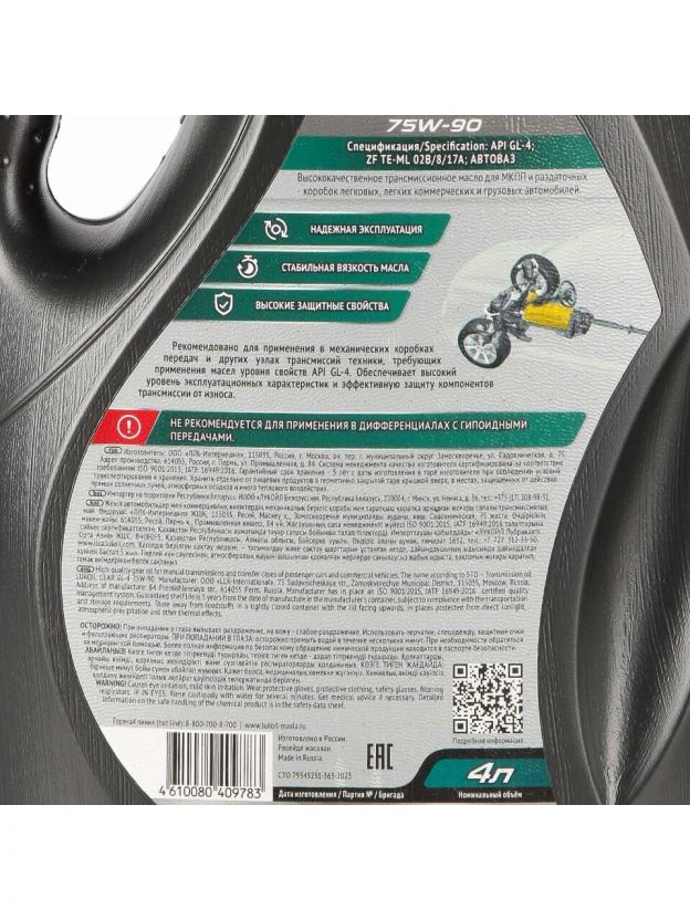 Масло трансмиссионное полусинтетическое 75W90 Лукойл GEAR GL-4 — оптимальное решение для защиты КПП и редукторов, увеличьте срок службы трансмиссии без переплат. Почему выбирают: Современная полусинтетическая формула — стабильная работа трансмиссии в любых климатических условиях. Стандарт SAE 75W90 и объем 4 л — универсально для легковых и коммерческих авто, снижает износ и шум. Подходит для гаража и дачи — легко подобрать и залить, экономия на сервисе. Трансмиссионное масло Лукойл GEAR GL-4 75W90 полусинтетическое — это выбор автовладельцев, которым нужна надежная защита коробки передач зимой и летом. Благодаря сбалансированной формуле масло снижает трение, предотвращает образование отложений и обеспечивает плавное переключение передач. Часто спрашивают, какое трансмиссионное масло выбрать для механической коробки передач — 75W90 GL-4 подходит для большинства легковых и грузовых автомобилей, особенно если важна защита в условиях перепадов температур. В сравнении с полностью синтетическими аналогами это масло обеспечивает идеальный баланс между ценой и долговечностью, а по сравнению с минеральными — лучше сохраняет свойства при высоких нагрузках. Как использовать масло Лукойл GEAR GL-4? Просто залейте в соответствии с рекомендациями производителя авто, масло совместимо с большинством отечественных и зарубежных моделей. Подходит ли для зимы? Да, вязкость 75W90 обеспечивает легкий запуск и защиту механизмов даже при низких температурах. Оформите заказ сейчас и получите гарантию качества от официального продавца. Масло Лукойл GEAR GL-4 — выгодное решение для тех, кто ценит надежность и экономию. Частые вопросы: Какое трансмиссионное масло выбрать для механической коробки передач? Полусинтетическое масло Лукойл 75W90 GEAR GL-4 (артикул 3590973) подходит для большинства МКПП легковых и коммерческих авто, соответствует стандарту SAE 75W90 и спецификации GL-4. В чем выгода использования масла Лукойл GEAR GL-4 75W90? Снижает износ и шум, облегчает переключение передач, защищает детали при перепадах температур и обеспечивает экономию на ремонте. Какой объем и страна производства? Объем упаковки — 4 литра, страна продавца — Россия. Масло легко подобрать для замены в большинстве популярных моделей автомобилей.