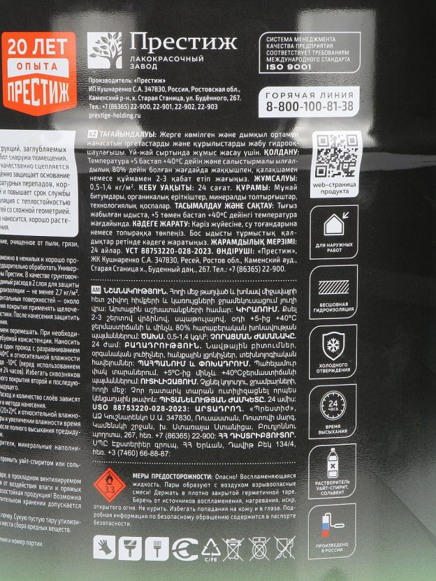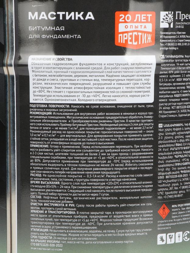 Мастика битумная Престиж — оптимальный выбор для гидроизоляции фундамента, наружных стен, цоколя. Эластичная битумная основа обеспечивает прочное сцепление с бетоном, железобетоном, деревом и металлом. Благодаря атмосферостойкости и теплостойкости до +80_С, мастика сохраняет защитные свойства при любых погодных условиях. Использование мастики возможно при температуре от -10 до +40_С, что удобно для большинства климатических зон России.