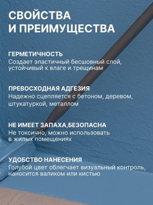 Однокомпонентная полиакриловая мастика для гидроизоляционной защиты поверхности. Мастика предназначена для образования бесшовного эластичного водонепроницаемого слоя, обладающего высокой сопротивляемостью на разрыв. Мастика быстросохнущая, без запаха, не токсична. Не требует специальных мер защиты при применении. Цвет материала - голубой, что обеспечивает удобство нанесения.
