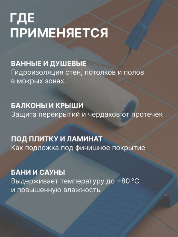 Мастика обладает прекрасным сцеплением с плиточными клеями и модифицированными штукатурными составами. Мастика может использоваться для стен и потолков, полов и стяжек перед укладкой кафельной плитки, паркета, ламината, линолеума. Гидроизоляционный материал также используется при устройстве тёплых полов.